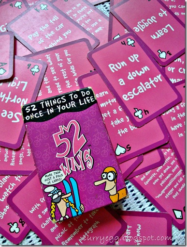 Her idea has reminded me about a very special poker cards which I had bought during in my highschool year. It is called the ‘52 Things To Do Once In Your Life’. There are 52 list of ideas on what you can do to spice up your life by trying new, crazy stuffs. Life is boring when you’re too conditioned with routine right?